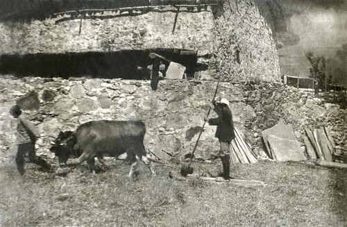 ფოტოზე გამოსახულია კალო, ხარ-უღელი, მხვნელი და ხვნის დასაწყისი პროცესი ...