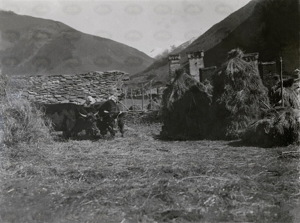 | შინაარსი: | ფოტოზე გამოსახულია მოსავლის გალეწვის განსაკუთრებული მეთოდი, რომელიც გამოიყენებოდა მხოლოდ უშგულის თემსა და კალის თემის სოფ. ხალდეში. - სამ ან ოთხ ხარს შეაბამდნენ ერთ უღელში და ატარებდნენ კალოზე, თვითონ კი მიჰყვებოდნენ უკან ხარებს და ძირს დაყრილ მოსავალს თელავდნენ ფეხებით. ან სხდებოდნენ ცხენებზე და ისე ალეწვინებდნენ ხარებს მოსავალს | |