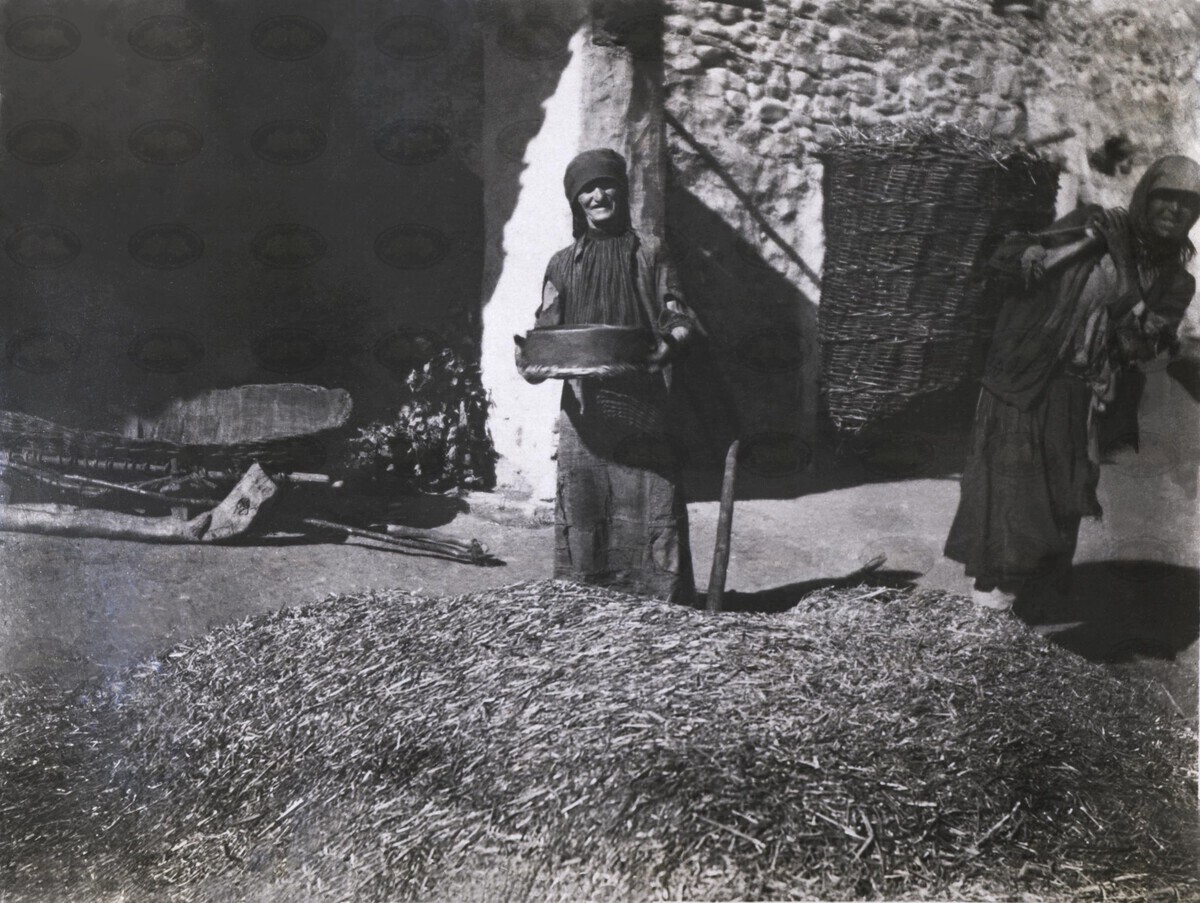 ფოტოზე გამოსახულია მარცვლეულის რეცხვის პროცესი. ჭურჭლად ხმარობდნენ ხის დიდ მორს...