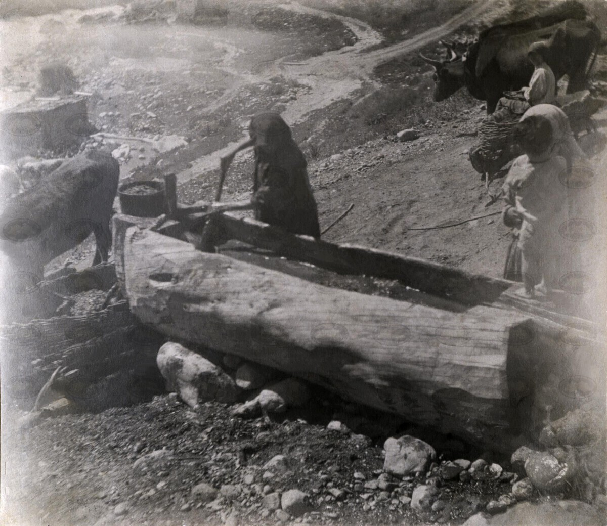 ფოტოზე გამოსახულია მარცვლეულის რეცხვის პროცესი. ჭურჭლად ხმარობდნენ ხის დიდ მორს...