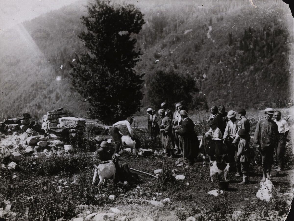 | ავტორისეული აღწერა: | "წარწერა უკანა გვერდზე: №33 ”фот. Д. Кожевниковой. 29/VI 1931 г. Ст. Ст. Бечви. Сел. Мазер. День parpolani 2-ой момент жертвоприношения. После общей молитвы старикоы над жертвенными животными животное кружат на одном месте по солнцу.""" | |