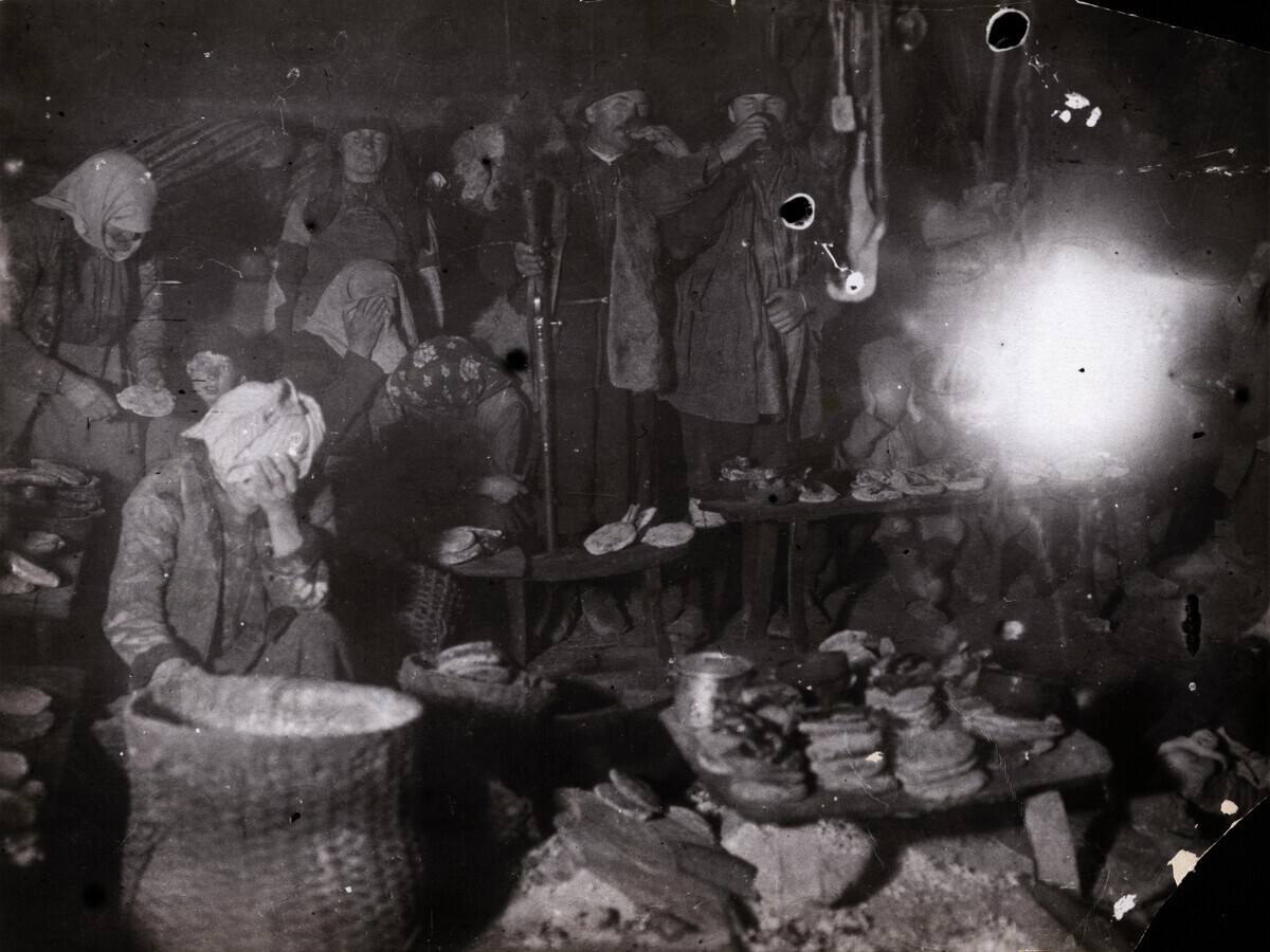ფოტოზე აღბეჭდილია გლეხი კალათებით, მარცვლეულის თესვის პროცესში...