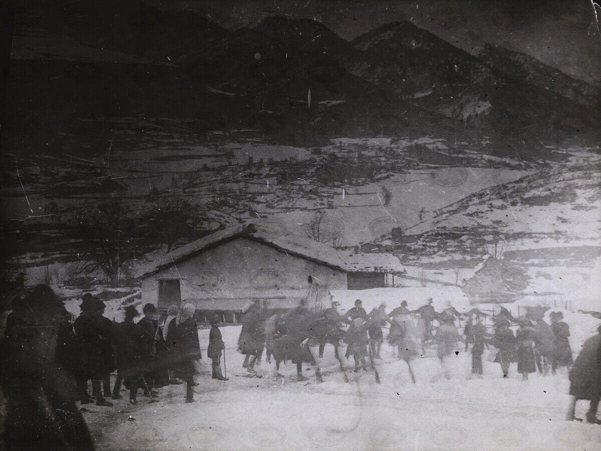 ფოტოზე ასახულია მარხილით მიცვალებულის საკურთხი მაგიდის სასაფლაოზე გატანის პროცე...