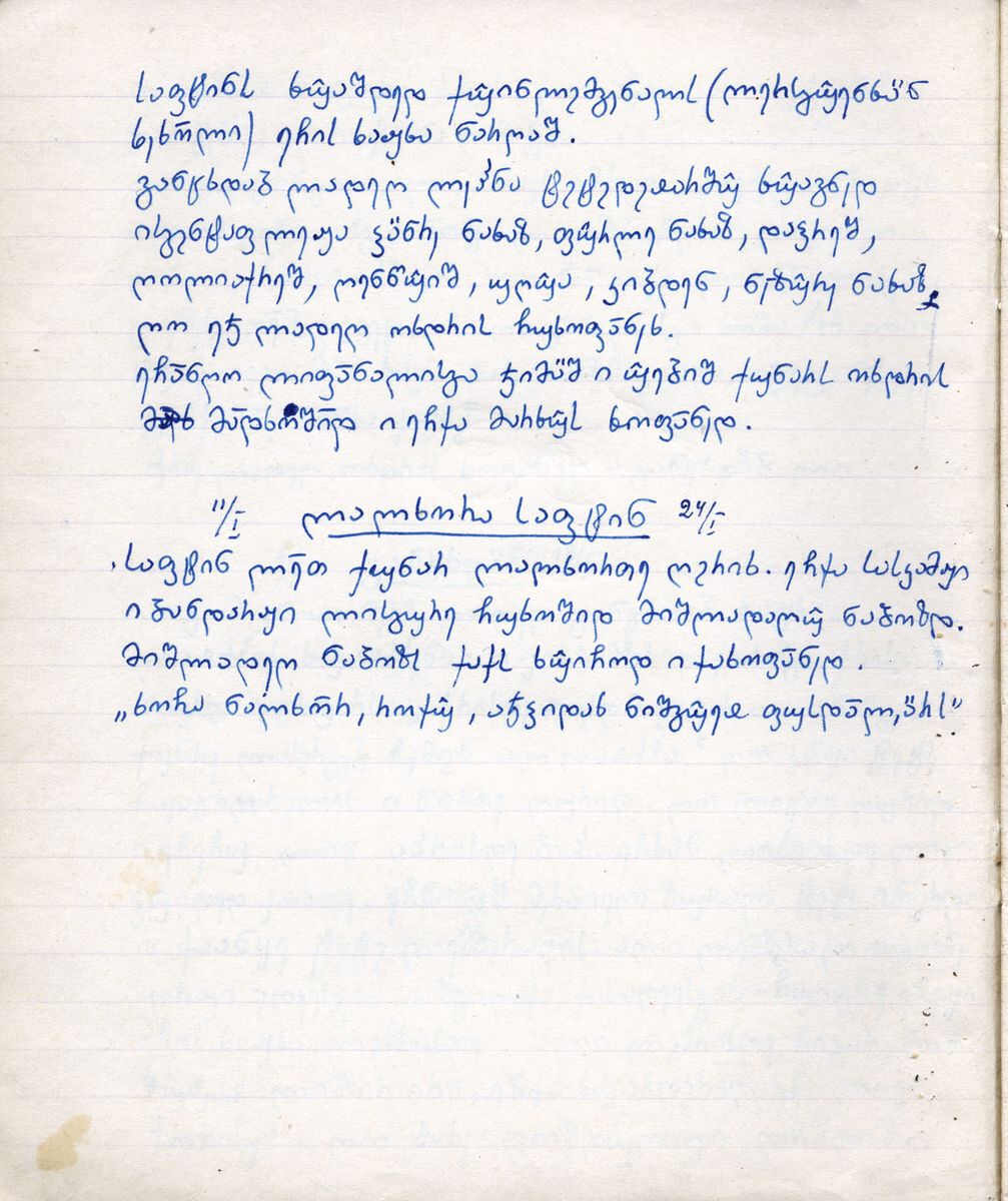 | შინაარსი: | შაბათს საღამოს სულები ლალხორში მიდიêნ. მაშინ სკამზე და ბანდარზე დასხდომა შეუძლიათ ცოცხლებს კვირა საღამომდე. შაბათ საღამოს ფაფას დაახვედრებენ და შეუნდობენ; -„კარგი განაჩენი მოგეტანოთოო ჩვენთვის, ჩვენო ფუსდ დალებო“ | |
