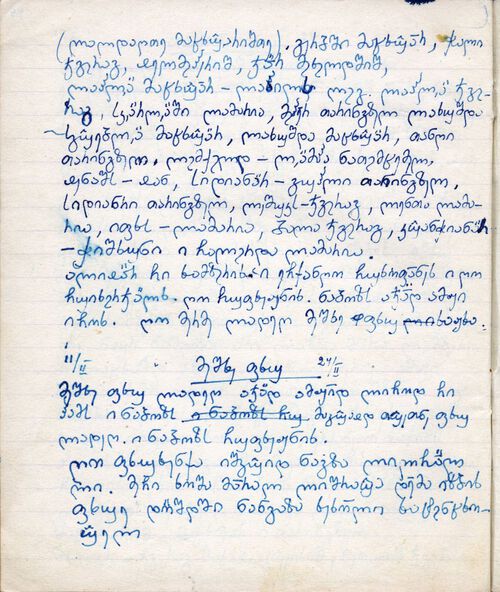 | შინაარსი: | 11/02 მეშხე ფხუ 24/02 მეშხე ფხუს დღეს ისევ ისე მოვემზადებით და აღვასრულებთ ლოცვას დილასაც და საღამოსაც როგორც თეთნე ფხუს დღეს. საღამოს დავიშლებით. ამის მერე ამ ფხუდან 7 კვირა არის მარხვა. მოხუცებულები ხსნილს არ ჭამენ ამ ხნის მანძილზე - მარხულობენ. ფხუდან ერთი კვირის თავზე ხვდება „ხატèნცხოველობა“. | |
