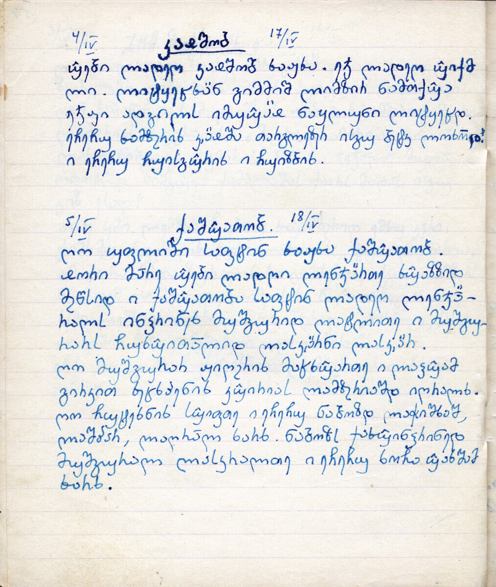 | შინაარსი: | პარასკევ დღეს კაიშობა ჰქვია. ის დღე უქმეა. მეწყერის საწინააღმდეგოდ. ლოცვას აღვავლენთ იმ ადგილას, სადაც ამისი (მეწყერის) გვეშინია. აქ აღავლენენ ლოცვას „კêÎშა თêრგლეზერის“- თვის. – „ისგუ ბეტკ ლოხოდ“ - შენი კიდე გადაუდე!. ლოცვის მერე იქ დაასხდებიან და შესჭამენ ლემზირებს. | |