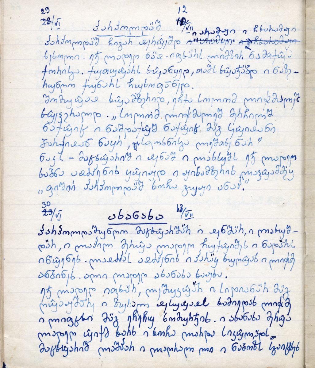 | შინაარსი: | 30/06 ახანახა 13/07 პეტრეპავლობის მერე მაცხვარიშელები და Îენაშელები, ლახუშდელები და ლაჰილელები ნადს მოიწვევენ. საკლავს დაკლავენ, სასმელს წაიღებენ და მათ სათიბში მიაკითხავენ. ამ დღეს იწყება თიბვის პერიოდი და მას ახანახა ჰქვია. იმ დღეს იფხელები, ლეშუკელები და სიდიანარები კაციც და ქალიც, ვისაც კი შეუძლია თიბვა და ფარცხვა, ყველა მათ ეხმარება (?) და ახანახა მეორე დღეს მარხვაა და კარგ- მხიარულ დღეს - გამართავენ სიკçილადზე. | |