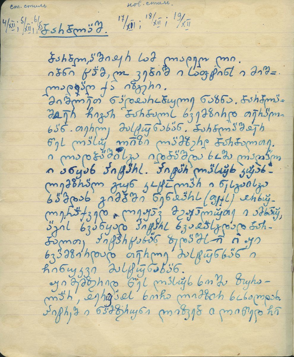 | ავტორისეული აღწერა: | მულახი, სოფ. ჟაბეში (მთქმელი დაულ ავალიანი, კახიანების ასული, 54 წლის) ჩაწერილია 1946 წ. | |
