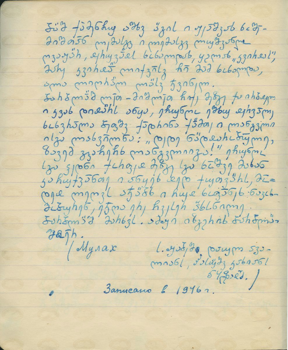 | ავტორისეული აღწერა: | მულახი, სოფ. ჟაბეში (მთქმელი დაულ ავალიანი, კახიანების ასული, 54 წლის) ჩაწერილია 1946 წ. | |