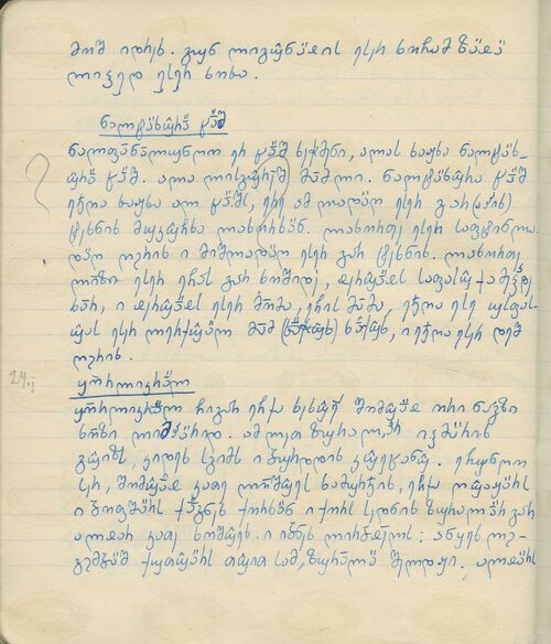 | შინაარსი: | ლიფანალის კვირეულის შემდგომ რომ ხუთშაბათი მოვა, ამას ჰქვია დაბრუნების ხუთშაბათი. ეს არ არის უქმე (ლისგვრეეში) ანუ ჯდომისა. დაბრუნების ხუთშაბათი იმიტომ ჰქვია ამ დღეს, რომ თურმე კოჭლები მხოლოდ ამ დღესღა აღწევენ ლალხორიდან, თურმე კოჭლები მხოლოდ ამ დღესღა ბრუნდებიან ლახორიდან. ლახორში თურმე მიდიან შაბათ დღეს და ბრუნდებიან კვირა დღეს. (შდრ. მზის დღეს < მიჟ–ლადეღ). ლახორში წასვლა მხოლოდ იმას შეუძლია, მხოლოდ იმისთვისაა თურმე ნებადართული, ვისაც საფასე გადახდილი აქვს. და ვისაც – არა, იმას წასვლა არ შეუძლია. იმიტომ რომ დაუფასებელს (უსფასუას ) თურმე შესამოსელი არ აცვიათ და ამიტომ ვერ მიდიან. | |
