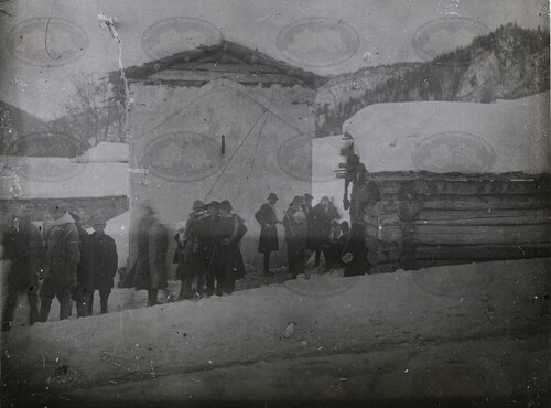 ფოტოზე ასახულია საახალწლოდ ტყიდან მსხლის ღეროების, თხილის ტოტების კონის მოტანი...