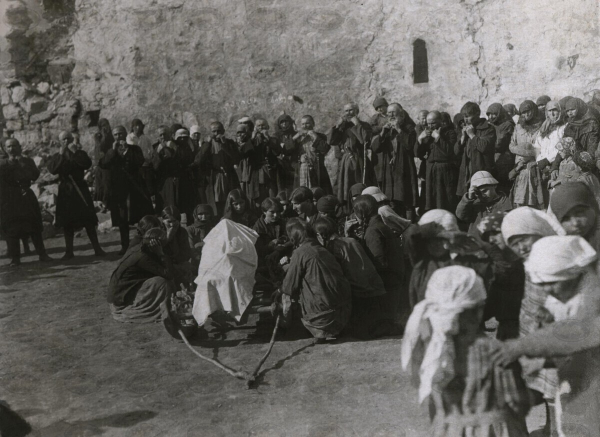 | შინაარსი: | ფოტოზე გამოსახულია ლატალის თემის სოფ. იენაშის მკვიდრის ბიაზრუკ წერედიანის დატირების ცერემონიალი, მარხილზე დასვენებულია მიცვალებული, გარშემო ჭირისუფალი ქალები, ფეხზე მდგომი მგლოვიარე მამაკაცები ტირიან და მოთქვამენ, ხშირ-ხშირად წვერზე იკიდებენ ხელს თითქოს იხოკავენ 1931 წ | |