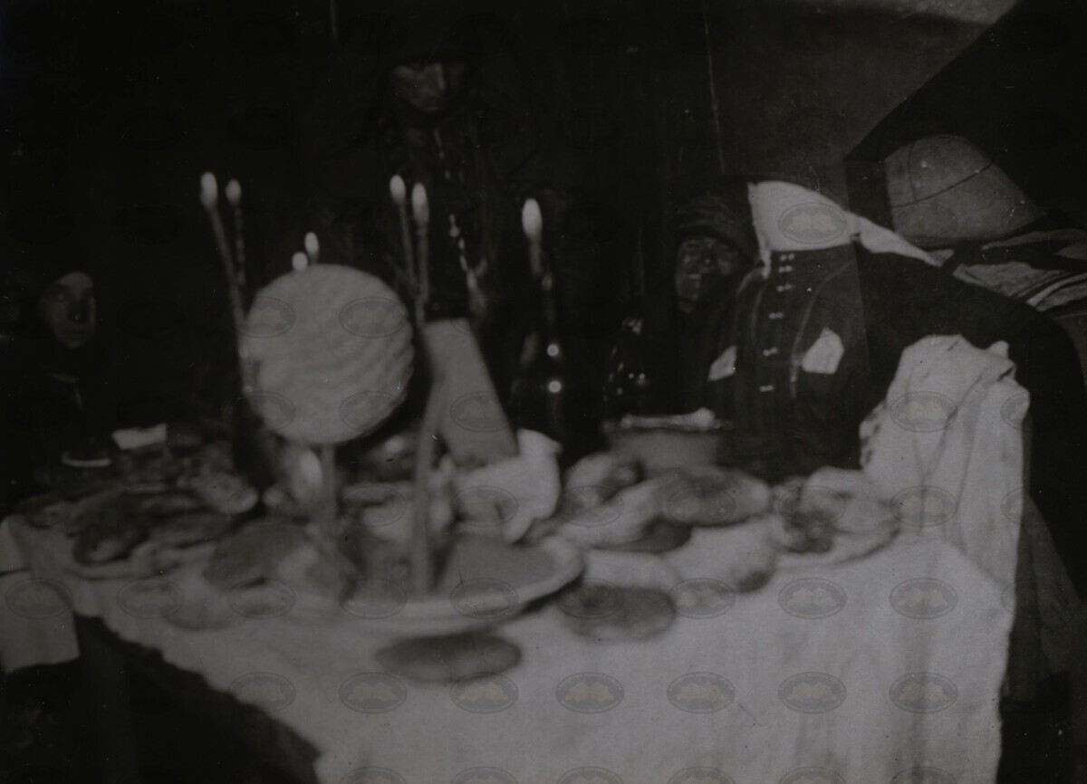 | შინაარსი: | მიცვალებულის სულის მოსახსენებელი საკურთხი სუფრა გარდაცვალებიდან მეორმოცე დღეს, მაგიდასთან გარდაცვლილის გამოსახულებით საკუთარ სამოსში | |