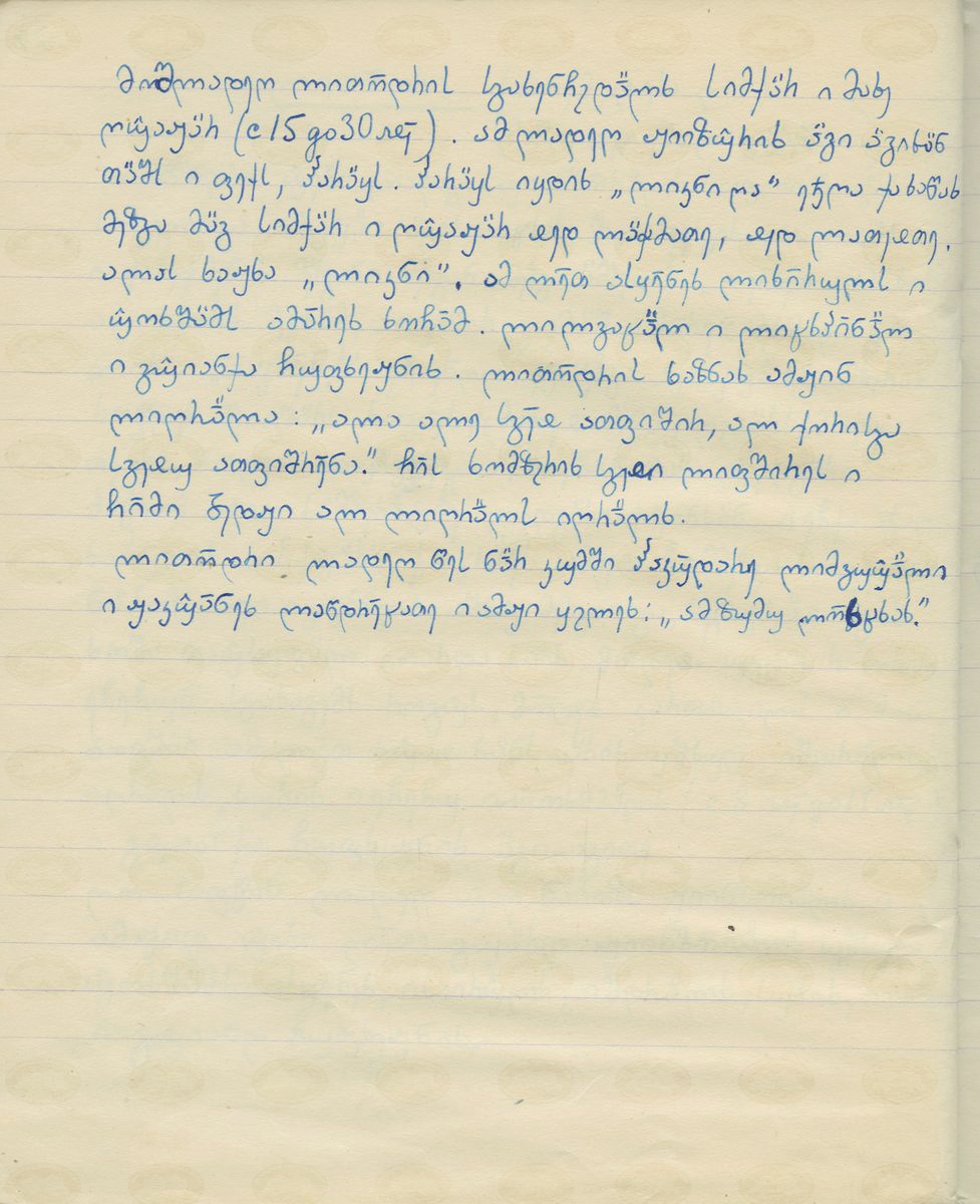 | შინაარსი: | ლითოოდრი ხვდება პარასკევ დღეს. ამ დღეს მთელი სოფლის ბავშვები შეიკრიბებიან სადმე, სადაც ურჩევნიათ. თან დაიკავებენ დიდ გობს (ლალაშს ) და გამოყვებიან ოჯახ–ოჯახ, კარდაკარ. თითოეულ ოჯახს ლოცავენ ასე: „ღმერთო დალოცე ამ სახლის მოზარდები, ამრავლე ადამიანები და სულდმული, საქონელი“. ლოცვის ტექტს ამბობს ერთი, დანარჩენები კი პასუხობენ: „აამინ!“ ამის მერე, ის ოჯახი, რომელიც დალოცეს, ამ ბავშვებს გამოუტანს ცერცვს, გამომცხვარ პურს, ანდა ფულს, ან ჩირს... ახალი მიცვალებულის პატრონი ოჯახები ზოგჯერ მიცვალებულის სულსაც დაალოცვინებენ ბავშვებს. და ამის მერე კიდევ დამატებითაც აძლევენ ბავშვებს საჩუქრებს. ასე შემოივლიან ბავშვები სოფლის ყველა მოსახლეს. საღამოს კი შეიკრიბებიან ერთ რომელიმე ოჯახში, სადაც უფრო თავისუფლად გრძნობენ თავს, ანდა უკაცრიელ სახლში. იქ ჩაადგამენ მოსახარშად ან ცერცვს ან კარტოფილს. ბავშვები ამ ღამეს ძალიან დიდხანს არიან ერთად, თამშობენ, მღერიან, ცეკვავენ და იქვე ივახშმებენ ხოლმე. გვიანობას დაიშლებიან და წავლენ თავთავიანთ სახლეში. (ეს ბავშვები ასაკით არიან 8 –დან 17 წლამდე). შაბათ საღამოს კვლავ შეიკრიბებიან და პარასკევის საღამოს მსგავსად კვლავ ერთად მოიმზადებენ ვახშამს, მხიარულობენ, ცეკვავენ, მღერიან და გვიან დაიშლებიან ხოლმე. კვირა დღეს ლითოდრის მონაწილე ბავშვებს შეუერთდებიან ასევე ქალიშვილები და ვაჟკაცები (15 –დან 30 წლამდე ასაკისა). ამ დღეს ყველანი შინიდან, საკუთარი სახლიდან მოიტანს და ასე მოაგროვებენ ხოლმე ყველს, ფქვილს და არაყს. არაყს ყიდულობენ ლიკნის სანაცვლოდ. ამა თუ იმ ოჯახს რომ სოფლის ქალიშვილები და ვაჟები შეეწევიან და ხელს შეაშველებენ ან თიბვაში, ან მკაში ამას ჰქვია (ლიკნი). ამ ღამეს გააჩაღებენ ხოლმე მხიარულებას თავდავიწყებამდე და კარგ ვახშამს გაამზადებენ აუცილებლად. მთელი საღამო ახალგაზრდები ხუმრობენ, ოხუნჯობენ და გვიანობას იშლებიან. (ზოგჯერ მოტაცებებიც ხდება ასეთ საღამოებზე (ლიცხუპინაალ). ლითოდრიზე სჩვევიათ ასეთი სიმღერა: „ესა, ესე ძეები და ვაჟები ამრავლე, ამ სახლს ვაჟიანობა ჰქონოდეს, ძეები გაუმრავლდეს“. ყველას უსურვებენ ვაჟების სიმრავლეს და ყველას სახლთან ამ სიმღერას მღერიან. ლითოდრის დღეს წესად გვაქვს საქონლისთვის კუდების ბალანის მოჭრა და მოწესრიგება. მოჭრილ კუდებს ააგდებენ (ლაწდრეეცათე ) მაღლა და ასე იტყვიან ხოლმე: „ამოდენამც გაზრდილიყვნენ“. | |