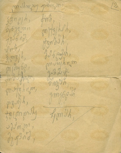 | შინაარსი: | "სათიბების სახლები: ვიდერ, ნენგვლი, ჟვნიშ ჭიბ, ელვერ, ლემუნდ, ჭიბრილ, ლაჭვრილ, ღვაზერ, ჯვედილარე, ამპოლ, მჟიშ, ჭიბ, ლეჭვერრ, ტვიბრ, ბნდურ, ლაურილ, გარმაჭ, წიფრ, გოგნდრ ჩელრ " | |