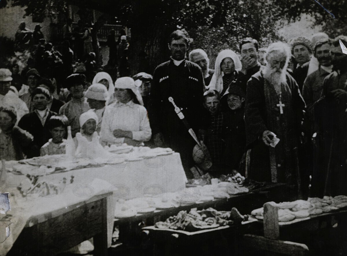 გარდაცვლილის სულის მოსახსენიებლად გარეთ გაშლილი სუფრები...