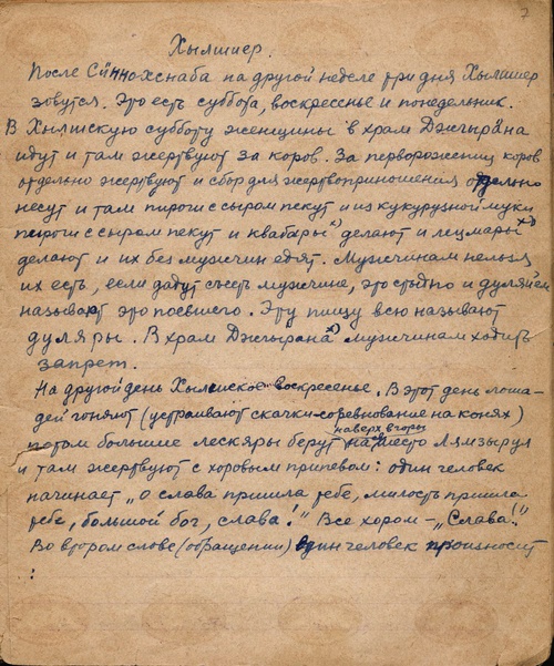 | ავტორისეული აღწერა: | ჰჷლიშიერ - სინნოხსნაბის შემდეგ კვირას სამი დღის ( შაბათი, კვირა, ორშაბათი) აღნიშვნა, რომლესაც ჰჷლიშიერ-ს ეძახიან. აღწერილია ქალების ჯგრანის სალოცავში საკლავის, ხორბლის და არაყის მიტანა და აღწერილია ამ დღესთან დაკავშირებული წესები და ტაბუები, დოღი. ლესკარის მიერ მთაზე ფერხულით დიდების შესრულება. | |