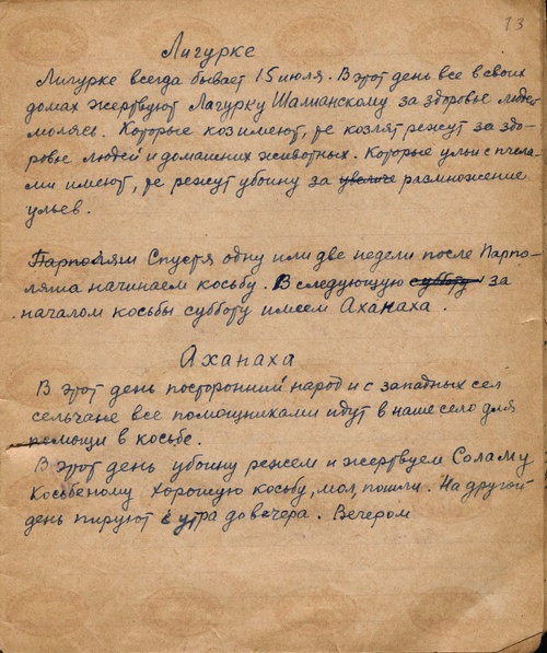 | ავტორისეული აღწერა: | ლიგურკე - ყოველთვის 15 ივლისს მოდის. ამ დღეს ყველა ოჯახი საკუთარ სახლში შესაწირავს სწირავს ლაგურკე შალიანს ადამიანებისა და საქონლის ჯანმრთელობისთვის. ეწირება ციკანი. შესაწირავები კეთდება სკების მოსამრავლებლადაც. პარპოლაშის შემდეგ ერთი ან ორი კვირის შემდეგ მოდის თიბვის შაბათი - ახანახა. ამ დღეს მეზობელი სოფლებიდან მოდის ხალხი თიბვაში დასახმარებლად. ამ დღეს საკლავი ეწირება სოლამს (სოლომონს) და სთხოვენ კარგ თიბვას. მეორე დღეს ნადიმობენ დილიდან საღამომდე. | |