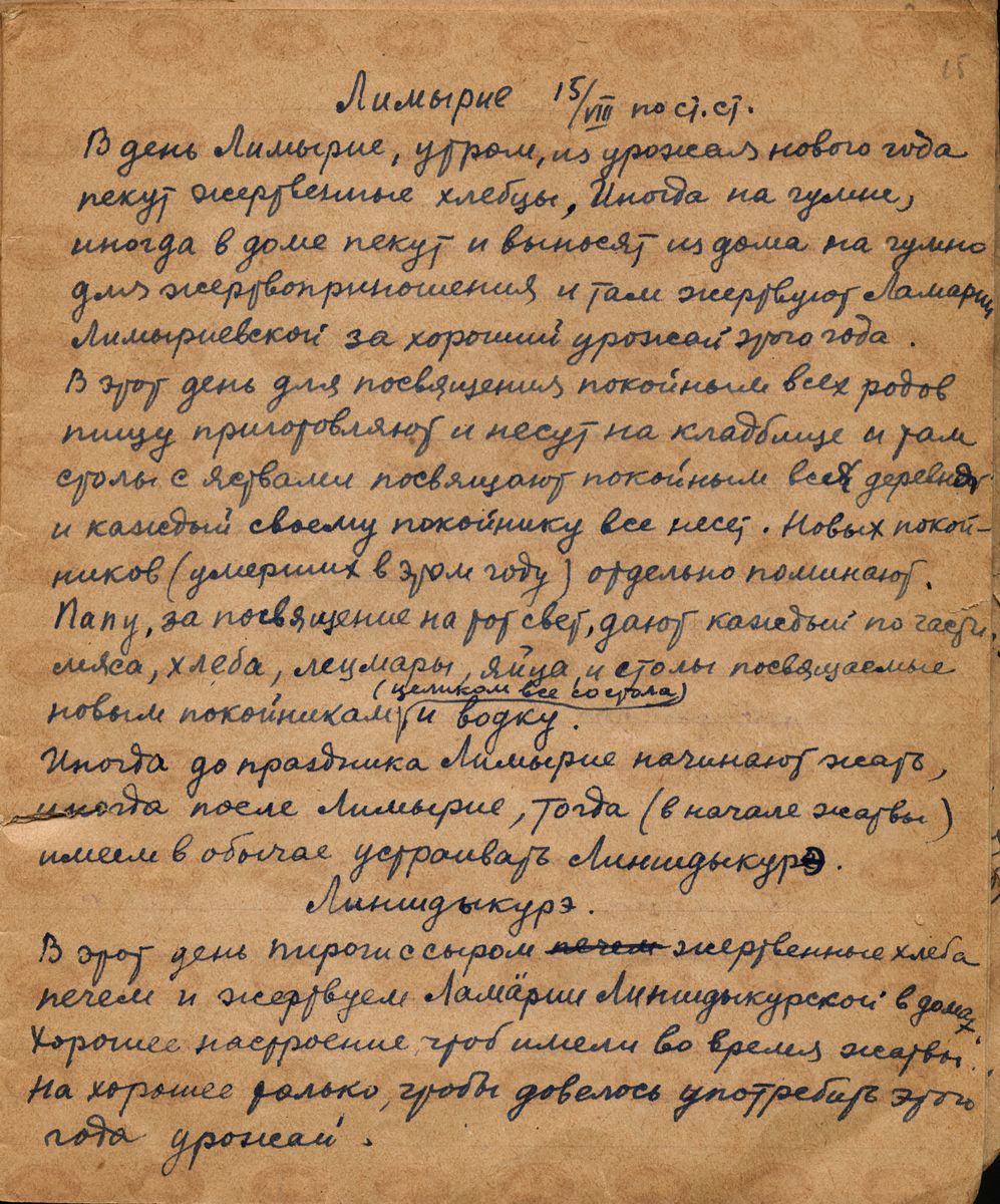 | ავტორისეული აღწერა: | ლიმერიე 15 აგვისტო. ახალი კარგი მოსავლისთვის სახლში გამომცხვარი პურების შეწირვის წესი კალოზე ლამარიასთვის. ამ დღეს ყველას თავისი მიცვალებულისთვის მიაქვს ყველანაირი საკვები სასაფლაოზე. ახლად გარდაცვლილებს ცალკე იხსენებენ. მკა იწყება ან ლიმარიეს დღესასწაულამდე ან მის შემდეგ და ასრულებენ ლინშდიკურეს წესს. ლინშდეკურე- ყველიანი პურები ცხვება და იწირება ლამარია ლინშიკურესთვის. სახლში აუცილებლად კარგი განწყობა უნდა სუფევდეს პურების შეწირვის დროს. | |