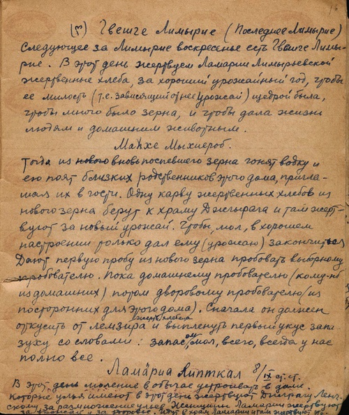 | შინაარსი: | ღუეშე ლიმერიე მარიამობის შემდეგი კვირაა, რომლის დროსაც კარგი მოსავლისთვის იწირება პურები. მაჰე მეჰერიობ დღეს ხორბლის ახალი მოსავლისგან აკეთებენ არაყს და ოჯახში ნათესავებს ეპატიჟებიან. შესაწირი პურების ნაწილი მიაქვთ ჯგრაგის სალოცავში და იქ სწირავენ ახალი მოსავლისთვის. ლამარია ლიპტკალ-ი - 8 სექტემბერი. ვისაც სკები აქვთ სწირავენ ჯგრაგს. ქალები ლამარიას სალოცავში მიდიან შესაწირავებისთვის. | |