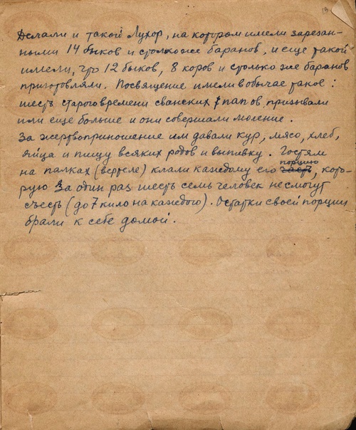 | ავტორისეული აღწერა: | ჴეობ- მოდიოდა ლალხორის შემდეგ კვირას. მთელი სოფლით ხდიდნენ არაყს. ლესკარები აცხობდნენ პურებს და სწირავდნენ საკლავს ჯგრაგის სალოცავთან. ამ პერიოდს ემთხვეოდა მიცვალებულთა ხსენების დღეები. ძველად ასრულებდნენ ლუხორს, რაც განკუთვნილი იყო კარგი ადგილის დასამკვიდრებლად საიქიოში და, ასევე, მიზნად ისახავდა ცოცხლების კეთილდღეობას. ვისაც ვაჟი არ ჰყავდა, ვაჟების შესაძენად დიდ ღმერთს სწირავდა ლუხორს. ამავე პერიოდში იცოდნენ ქორწილები. აღწერილია ლუხორი (საკლავების რაოდენობა, შესაწირი პურები). | |