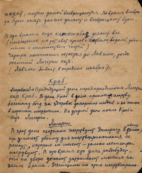 | შინაარსი: | კრაბ არის ლიგერგის წინადღე. სრულდება შესაწირავები დიდი ღმერთისთვის. მეორე დღეს ლიგერგია. ამ დღეს მონადირეების ასრუელბენ მსხვერპლშეწირვას. არაყს ქალები ხდიან. ცხვება შესაწირავი პურები.გამოხდილი არაყი ლიქვდიშის დღესასწაულზე გამოიყენება.მთაზე, მეზრა თარგლეზერის სალოცავში სრულდება სპეციალური რიტუალი,სოფელში დაბრუნების შემდეგ ნადიმობენ. | |