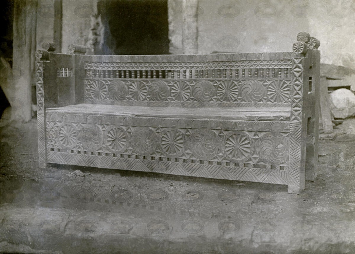 ფოტოზე გამოსახულია ხის მოჩუქურთმებული საკათხე, რომელიც დევს ლერგიმზე, გვერდით...