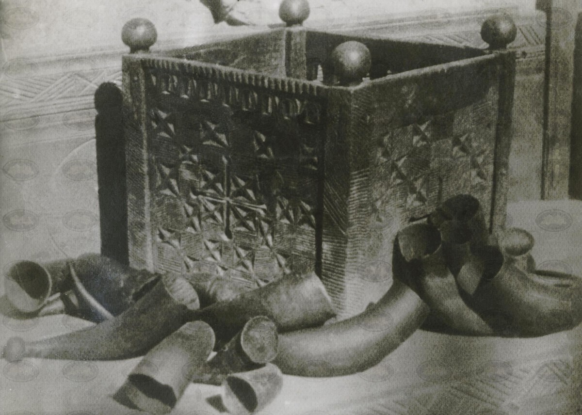 | შინაარსი: | ფოტოზე გამოსახულია ხის მოჩუქურთმებული საკათხე, რომელიც დევს ლერგიმზე, გვერდით ულაგია ყანწები | |