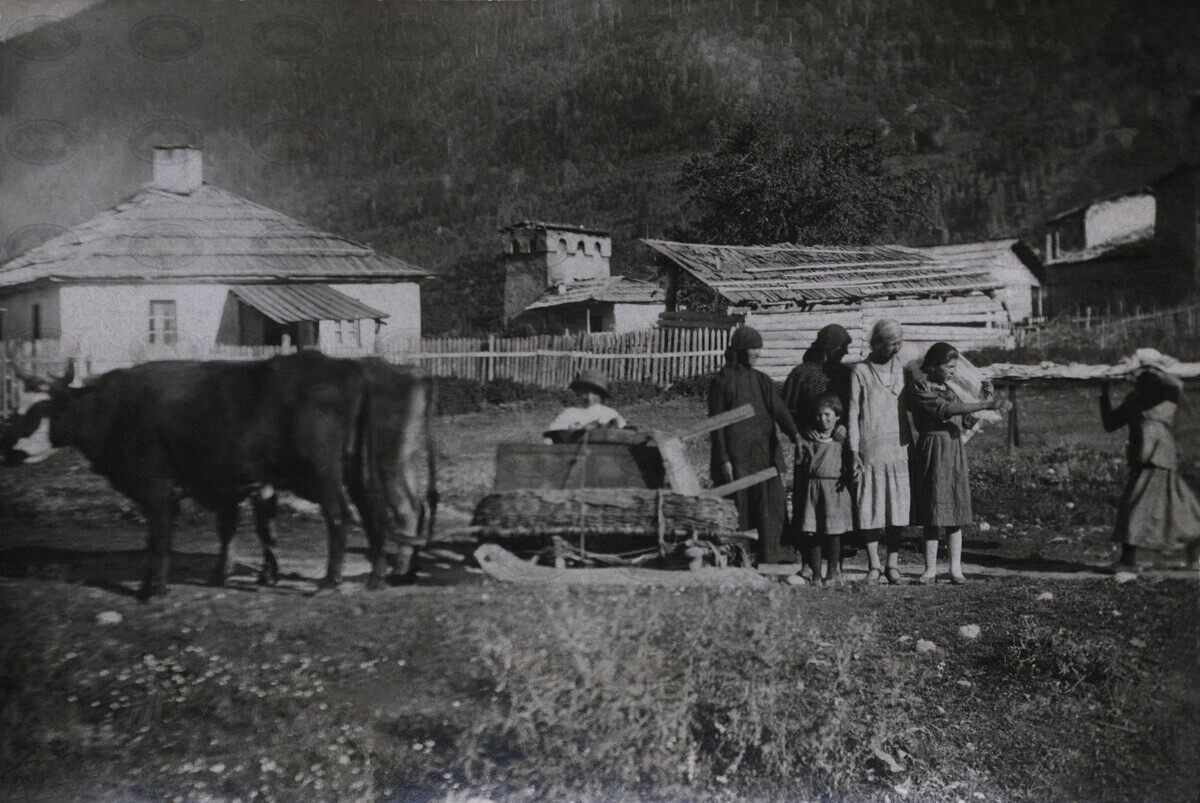 ფოტოზე გამოსახულია ხარებში შებმული კევრით მოსავლის გალეწვის პროცესი ...