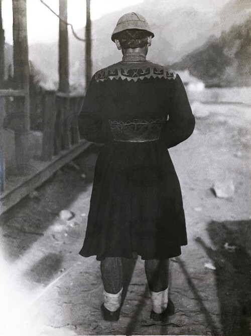| შინაარსი: | ფოტოზე გამოსახულია სვანი მამაკაცი, რომელსაც თავზე ახურავს სვანური ქუდი და აცვია სვანური ჩოხა. ჩოხა ბეჭების არეში გაფორმებულია ტყავისგან გამოჭრილი სვანური გეომეტრიული ორნამენტებით. ფეხზე აცვია თეთრი შალის დაბალყელიანი წინდები, | |