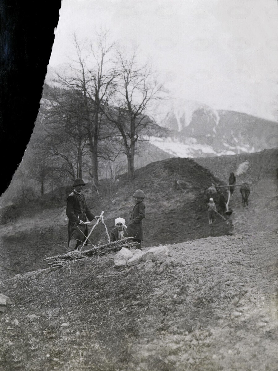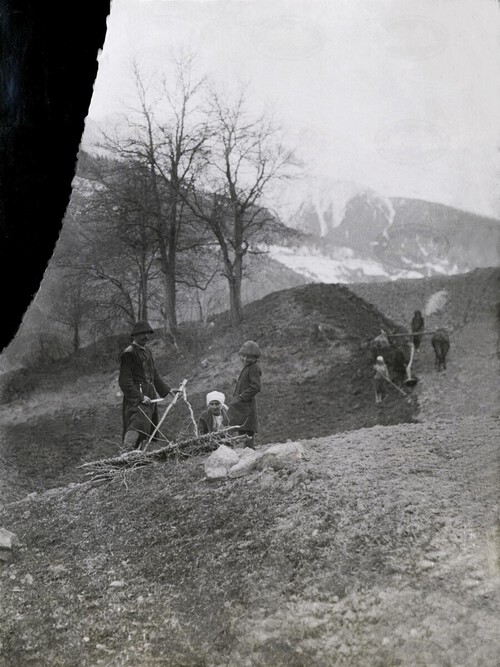 | შინაარსი: | ფოტოზე გამოსახულია თათებიანი ფარცხის შეკეთება. სვანი ქალის, მამაკაცისა და ბავშვის გამოსახულება. მამაკაცს აცვია ჩოხა-ახალუხი და თავზე ახურავს სვანური ფარფლიანი ქუდი. ასეთივე ქუდი ახურავს ბავშვსაც. ქალს თავზე თეთრი ქსოვილის თავსაფარი აქვს წაკრული. | |